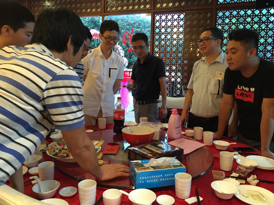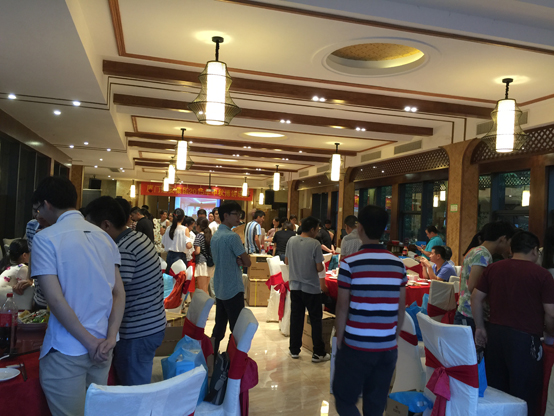 當(dāng)晚,伴著主持人曾怡航“開博”的一擊銅鑼聲,十三個(gè)博餅瓷碗里的骰子同時(shí)響起。第一輪博餅開始,全場(chǎng)骰子聲叮叮當(dāng)當(dāng),一秀、二舉、四進(jìn)、三紅、對(duì)堂、狀元相繼出桌,現(xiàn)場(chǎng)的氣氛一次次推向高潮,整個(gè)會(huì)場(chǎng)成了一片歡樂的海洋,桌上的禮品也悉數(shù)被員工收入囊中。經(jīng)過第一輪激烈初賽產(chǎn)生的13名桌狀元參與到第二輪的“狀元王中王”爭(zhēng)奪賽,爭(zhēng)奪最后的大獎(jiǎng),經(jīng)過激烈的角逐,王中王由來自四川的一位嘉賓幸運(yùn)地博到。臺(tái)下圍觀的員工們歡聲笑語,共享美酒佳肴,其樂融融。