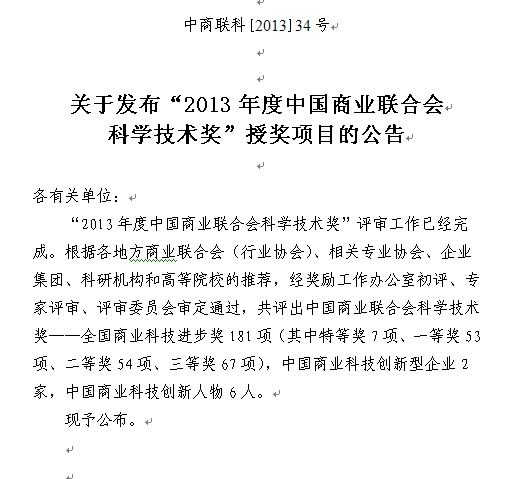 公司《大撓度下鋼筋混凝土板的受拉薄膜效應(yīng)》項(xiàng)目榮獲2013年度中國(guó)商業(yè)聯(lián)合會(huì)科學(xué)技術(shù)獎(jiǎng)——全國(guó)商業(yè)科技進(jìn)步獎(jiǎng)一等獎(jiǎng)。