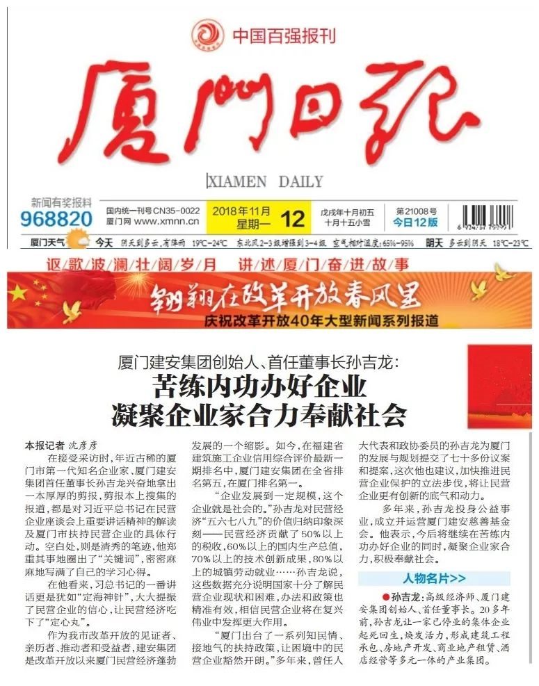 習(xí)近平總書記在民營(yíng)企業(yè)座談會(huì)上重要講話發(fā)表后,廈門市委市政府緊跟著出臺(tái)了《關(guān)于促進(jìn)民營(yíng)經(jīng)濟(jì)健康發(fā)展的若干意見》,就總書記提出的支持民營(yíng)企業(yè)發(fā)展的精神,及時(shí)落實(shí)?!稄B門日?qǐng)?bào)》近日開辟了“謳歌波瀾壯闊歲月 講述廈門奮進(jìn)故事”專欄,推出了“翱翔在改革開放春風(fēng)里——慶祝改革開放四十周年”大型新聞系列報(bào)道。11月12日,《廈門日?qǐng)?bào)》A02版以“苦練內(nèi)功辦好企業(yè),凝聚企業(yè)家合力奉獻(xiàn)社會(huì)”為標(biāo)題刊登了記者對(duì)建安集團(tuán)創(chuàng)始人、首任董事長(zhǎng)、建安慈善基金會(huì)理事長(zhǎng)孫吉龍的采訪報(bào)道。